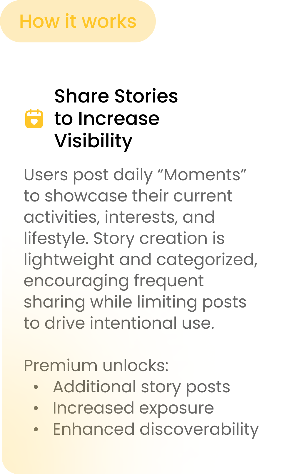 From this reframing, I developed Bumble Story, a feature that allows users to share short, everyday stories within the app. Rather than a blunt location ping, Bumble Story notifies users when someone nearby has recently posted, inviting them to explore stories and decide if they’d like to start a conversation. This shifts the experience from passive alerts to active discovery, giving users richer context about who they might connect with.
