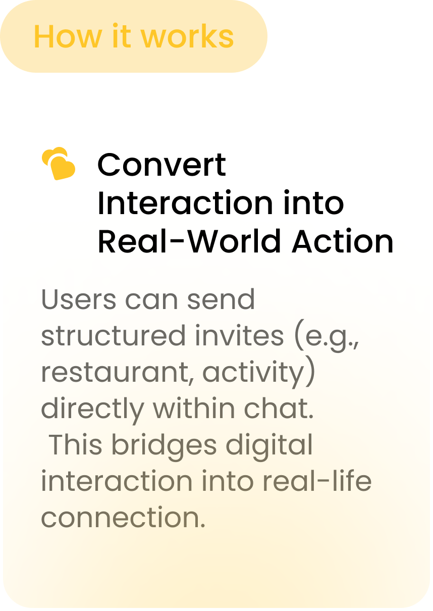 While the original brief focused narrowly on location-based notifications to drive subscriptions, I reframed the challenge around a deeper question: How can Bumble create more natural, authentic opportunities for people to connect in real time? Instead of simply alerting users that someone is nearby, the goal became fostering meaningful interactions that feel personal, engaging, and non-intrusive.